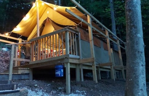 Large 10x12 elevated glamping tent with a 7' covered porch. Two chairs and a large security box bolted to the deck. We provide locks and keys to the security box. Fire extinguisher on the deck. Windows and doorway have bug screens and zippered closures.