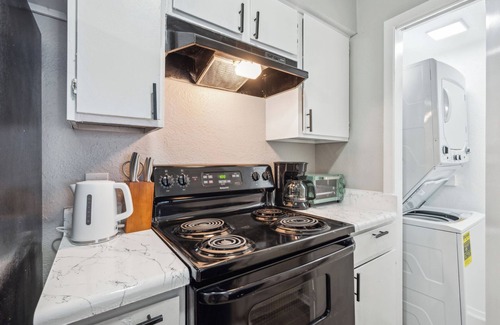 Relax in this thoughtfully designed apartment featuring a comfortable queen-size bed, smart TV, and dedicated workspace—ideal for business or leisure. The open layout includes a cozy living area, fully equipped kitchen with stainless steel appliances, built-in microwave, ice maker, and elegant 5-inch baseboards. Enjoy modern comfort with fast Wi-Fi, stylish decor, and plenty of natural light in a space that feels like home.
