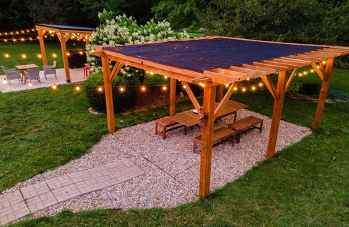 The Cottage is comprised of the Loft (King & Two TwinXLs), Full Bedroom downstairs, a living area with sofabed and TV, kitchenette, and bathroom with separate shower room and toilet room. Use of the backyard - firepit, picnic table, and grill. The cottage sits on our 3-acre property at the end of the road. Our private home and toy barn are also on the property.