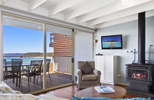 Open plan kitchen, dining and lounge room with slow combustion fire and electric heating for winter and pedestal fans for cooling in summer.