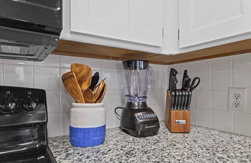 The kitchen is fully stocked with all essentials including a microwave, electric stove, toaster, fridge, dishwasher, and plenty of dishes, glasses, mugs, and utensils. Enjoy complimentary coffee to start your mornings right.