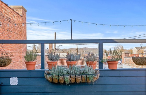 Overlooking quaint and charming downtown Hendersonville, North Carolina, the Demi-Lune is your escape from the city without leaving big city comforts behind. The Demi-Lune is located in a fully restored historic building, with second floor views over Hendersonville's Main Street. The Demi-Lune is spacious at over 1800 square feet, two bedrooms and two full baths, a sun room that spills out onto a back deck with breathtaking views of the Blue Ridge Mountains! The Demi-Lune takes its name from the floor-to-ceiling half-moon shaped window that looks out over Main Street Hendersonville.