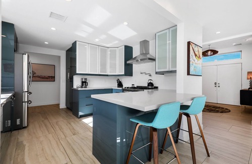 Upgraded mid-century modern flared kitchen with gorgeous finishes and open to your amazing backyard view. Amenities include a toaster, microwave, blender, oven with warming tray, dishwasher, refrigerator with water dispenser and ice maker, drip coffee maker, and more. Pots, pans, glasses (wine, mugs, cups), plates, bowls, oven, stove, utensils, and silverware. All the fixings for your next delicious family meal. Also has a seating-for-two island area to hang out and chat while the Chef is in action.