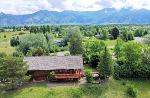 Magical mountain views encompass the rustic log home that is nestled in the foothills of the Gallatin Valley. Ten minutes from the airport, shopping, and fine dining. A chef's kitchen, covered wrap around deck with grilling, hot tub, Free WIFI, and Smart TV's. Easy access to