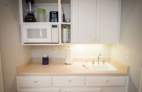 This cottage has two separate master suites that each have their own bathroom. There is a shared dining space that separates the two suites. It has an efficiency kitchen that is located in the dining area. The kitchen includes a full-sized refrigerator, microwave, Keurig coffee maker, an electric stove top and a small farmhouse sink. It has your basic necessities for cooking and dining. The cottage has a private firepit, grill, and courtyard!