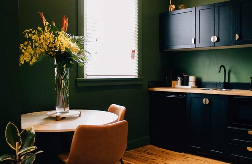 The Gilded Globe is quaint, quirky and full of character as far as heritage apartments go. It's located at the rear of the building and features original polished floorboards and a bold but soothing jungle aesthetic, with lots of texture and deco appeal. This studio has an open plan kitchenette, dining, couch and queen bed with Sheridan linen, as well as its very own hallway to nowhere! It has a central Leeton main street location (1-5 min walk to cafes & restaurants) and secure parking.