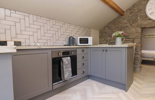 The Hayloft consists of a kitchen with an electric oven, electric hob, microwave and fridge, a dining area with seating for two people, and a sitting area with a Smart TV. There is one double bedroom with an en-suite walk-in shower, basin, heated towel rail and WC. Outside, there is a non-enclosed front garden with furniture and a gazebo, and off-road parking for 1 car. Within 0.7 miles, you will find a shop, and within 1.8 miles, a pub. One well-behaved pet is welcome, and please note that this is a non-smoking property. WiFi, fuel, power, bed linen and towels are all included in the price. Have a romantic getaway at The Hayloft. Note: There are steps leading up to the property, please take care. Note: Low doorways throughout, please take care.