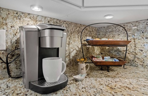 Upstairs we have the master bedroom with a king size plush bed and en-suite full bathroom including dual sinks, walk-in tile shower and large soaking tub! The views from the master bedroom are equally as amazing as the living area. Across the hall is another large bedroom with a king size bed and private en-suite full bathroom. In this bedroom's closet you'll find the high chair and pack-n-play if you need them for the little ones. For convenient sake we also have a half-bath in the hallway. As you get back to the kitchen, you'll find it fully stocked with all you would need to cook a wonderful meal for the whole group! The dining area seats 8 but you'll find 4 barstools at the kitchen island and outdoor dining for 7 if you need additional seating. Venturing into the living room, you'll find a large 65" smart TV that's setup for streaming from your own accounts anything you'd like. Also enjoy the gas fireplace on those cool evenings or winter getaways. The sectional sofa and lazy boy chair offer plenty of cozy seating.