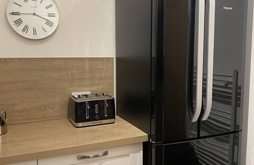 The kitchen has a fridge, a hob and oven, a kettle, coffee maker, a freezer and a microwave.