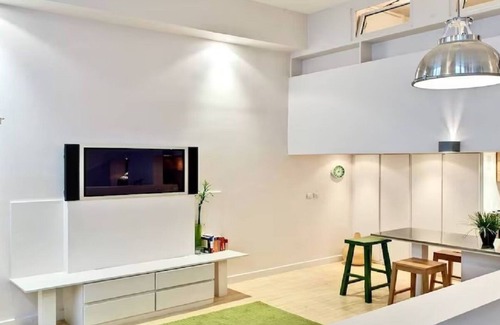 At the corner of the staircase leading to the basement and the first floor, a small Chinese chest of drawers with a green apple adds a brilliance of color to the harmonious white that serves as the backdrop for this luxury loft for short-term rental.