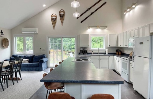 The Lodge at Moose Pond – Lakeside Luxury Meets Mountain Adventure Welcome to The Lodge, your ultimate retreat nestled on the serene shores of Moose Pond at the base of Pleasant Mountain in Bridgton, Maine. This expansive 6-bedroom, 3-bathroom home comfortably accommodates up to 20 guests, making it the perfect destination for family gatherings, corporate retreats, or a getaway with friends. Bedrooms & Bathrooms 6 Bedrooms – Spacious accommodations with a mix of king, queen, twin, and pull out sofa beds to suit families and groups 3 Full Bathrooms – Two on the main level and one on the lower level Fully Equipped Kitchen 2 Stoves & Ovens – Perfect for group meals and holiday feasts 2 Coffee Makers – Enjoy your morning brew with ease Dishwasher, Microwave & Toaster Cookware, Utensils & Dishes – Everything you need to cook and serve Entertainment & Games Pool Table Air Hockey Table Poker Table Skee-Ball Multiple Smart TVs – Stream your favorites from every common area Board Games & Cards – Family fun for all ages Relaxation & Outdoor Perks Private Indoor Hot Tub – Available in the colder months Private Lake Access – With swimming, paddling, a sandy entrance for summers or for ice fishing in the winter Outdoor Fire Pit – S’mores and stargazing encouraged