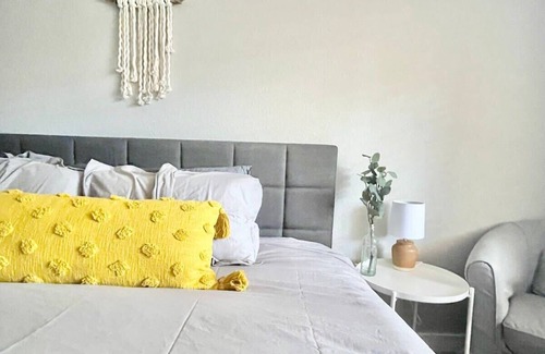 This boho family home is located in a beautiful and peaceful neighborhood where you get the taste of living like a local. Spacious rooms and high ceilings are perfect for family gatherings. With a full kitchen, treat your group to sweet meal, gather around the table with morning coffee, or take a cocktail to the backyard picnic table. You will love the luscious bathrooms!