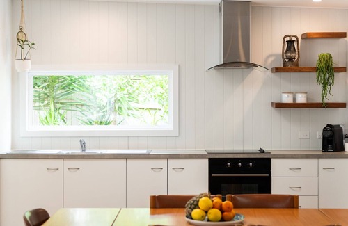 After a morning dip or a surf, rinse off in the private hot and cold outdoor shower before settling in for the afternoon on the generous timber deck. Surrounded by bamboo and established greenery, the garden evokes the feeling of a secluded tropical oasis. Share leisurely BBQ lunches, sip your coffee in the morning sunshine, or gather around the fire pit in the evening to toast marshmallows under the stars.