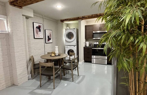 Enjoy a dining table and a desk workstation for both meals and productivity. Exposed brick walls enhance the unique character of the unit. The full kitchen provides all the essentials for your stay, and a full bath with shower ensures added comfort. The full-size washer and dryer offer additional convenience.
