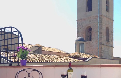 A small house on three levels, 70 square meters (about 630 square feet) plus two terrace levels with a 360 degree view of the town and the Ionian sea. Located on a quiet street with no through traffic, and ample parking on the nearby church piazza. Parking is free. The house was restored / redone in 2014, and it displays traces of its long history, including an exposed original wall from the 1600's and floor from the early 1800's. Downstairs there is a bathroom with washing machine and shower, a fully-equipped kitchen, a living area with double sofa bed and digital television. Kitchen includes oven, refrigerator, microwave, toaster, coffee maker and tea kettle, as well as all necessary kitchen utensils. The small storage room contains shelves for storing luggage, an iron and ironing board, and an extra twin bed if needed. There is a mini split air conditioner for cooling or heating, and a small wood stove, but with walls that are many feet thick, the temperature is almost constant year round. Upstairs the loft area comprises a large bedroom space with queen bed, wardrobe, desk and credenza, and space for an extra twin bed, on request. The bedroom overlooks the downstairs area, but has black-out shades, as well as a folding screen which blocks light from the small balcony.