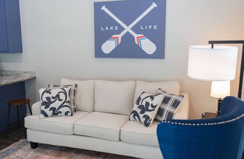 Two Creeks Crossing Resort's Deluxe Cabins have all the comforts of home and the wooded location gives them a cozy atmosphere. Each cabin features a full kitchen with refrigerator along with a bedroom that opens to the spacious back porch that’s perfect for sitting outdoors and enjoying the scenery. The couch in the living area folds out into an additional bed, making these cozy cabins perfect for families.
