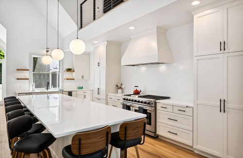 The open-concept living and dining areas boast soaring ceilings, large windows, and clean Scandinavian lines, creating a warm, light-filled space ideal for gathering. The fully equipped kitchen is outfitted with high-end appliances and generous counter space—perfect for preparing group meals or late-night snacks.