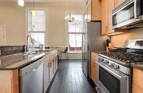 Spaciously appointed, large screen tv and surround sound , gourmet chefs kitchen, two full bathrooms, and plush Master Suite in addition to the large outside deck with seating and firepit to enjoy the open air sights of historic surrounding CBD building as you entertain with evening cocktails or quietly sip morning coffee