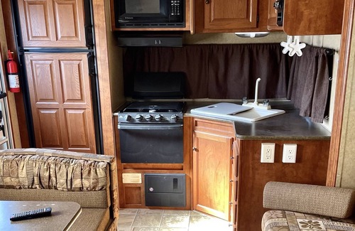 The Rambler Glamper has a Queen sized very comfy bed.. Full bathroom, closet space, Dining table for up to 4 and a Kitchenette with the Basics for cooking.