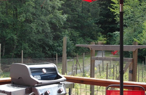 Villa Margot, our "butterfly" cottage, is a comfy retreat that sits on six beautiful acres of fir, spruce and cedar forest above our vineyard, five minutes from downtown Langley, our Village by the Sea, a ten minute walk. Quiet, peaceful, the villa has a cozy sleeping room with double bed, comfy seating area, upscale bathroom with large shower, and a galley kitchenette/eating area overlooking the vineyard to the south. A pleasant deck offers south and west sun, complete with chairs, table, umbrella and gas BBQ grill. A common firepit is available, nestled into the forest. The cottage is accessed by a country gravel drive through the forest and up the ridge. It's design is influenced by a contextually historic turn of century building from Whidbey Telephone Company, with parts incorporated into the structure. WiFi, smart TV are available, and heating and cooling. GENERATOR ON SITE. Stays of more than a week have access to on-site w/d.