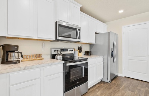 The home’s fresh and modern interior is a welcoming site, with open spaces perfect for relaxing as well as gathering together. The living room includes plush sofa and armchair seating along with a smart TV for streaming all your favorite shows and movies. A chic dining room table can seat 4 for formal meals, while 3 high-top barstools can be found at the kitchen counter for mealtime overflow or more casual bites. The kitchen itself is fully equipped, showcasing stainless steel appliances and sleek cabinetry stocked with all the cookware and dining ware you’ll need to whip up delicious meals at home. Step out onto the private back patio to take in the fresh air and feel the warm sun on your face, enjoying a meal al fresco or grilling up a delicious barbeque lunch.