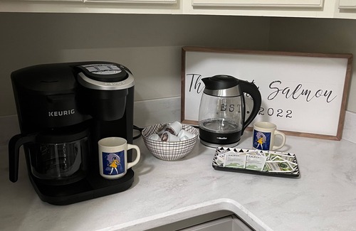 Stocked with coffee pods (regular & decaf) and assorted bags of tea