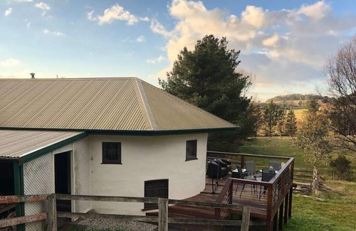 The converted silo is a unique and cosy space, with a fireplace and gorgeous cathedral ceilings with leadlight windows. The balcony is the perfect place to observe the sun rising over the endless hills and to say hello to our cattle.