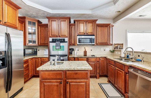 Our spacious home features an open floor plan and plenty of space for your group or family stay. Simplicity meets comfort! Upon entering the foyer, guests will sit and remove their shoes and place in the cubby before entering into the spacious living room with vaulted ceiling. Equipped with a smart tv for your favourite streaming services and several board games for a family fun game night! Through the double doors you're met with a huge screened in porch, overlooking the plush green, fenced lawn. A propane grill for delicious meals- guests are responsible for supplying the propane and cleaning the grill. Our kitchen is stocked with baking and cooking essentials, full-sized appliances, dishware, and cutlery for your dining pleasure. Our laundry room also includes full size appliances and a small amount of laundry products to get you started! You'll find all bedrooms adorn with queen size beds, desks, and their own smart tv. Three full bathrooms accommodate the home that are supplied with starter pack essentials. The owner suite is and oasis of serenity with a jetted bathtub, separate walk-in shower, and his and her sinks! The bonus room, off the foyer, offers privacy with it's own full bathroom. This is truly a home away from home!