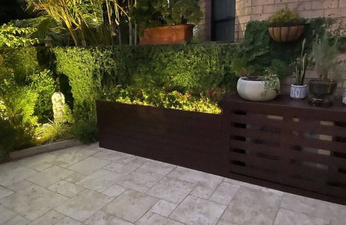 You will love the spacious garden courtyard of this apartment, it’s an entertainers delight. This 45 square meter travertine paved area has a small but luscious garden with mature palm tree and water fountain. During the day relax under the four meter square commercial umbrella that cantilevers to any position you desire. The six seater teak table is ideal for long lunches or leisurely evening meals prepared on the Weber BBQ that runs on mains gas (no refilling of gas bottles). Alongside the Weber BBQ is an outdoor drinks fridge for storing those cold drinks on warm days/nights. Underneath the kitchen window is a day-bed perfect for relaxing with your favourite book. The courtyard comes alive at night where a number of strategically placed lights showcase the foliage and features including the water fountain. Plates, cutlery and glassware are stored in the outdoor BBQ cabinetry for your ease of use.