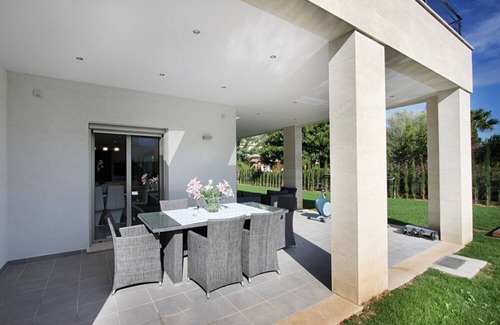 Just a few meters from the quiet beach "Llenaire" in Puerto Pollensa you find this outstanding Villa in a very quiet residential Side Lung named Llenaire. The villa has a fantastic pool and a large garden with a large lawn and many plants and flowers. The house has a modern, contemporary flair. The Mallorcan stones that cover some of the walls, creating a contrast to the wooden upper area of the villa. The outside does not let the large interior of the house. Passing the pergola at the entrance is an impressive hall that leads straight into the living room to, on the left is from the floor staircase to the first floor one of the two bedrooms on the ground floor. The large rooms of the house and the furniture Luxurious facilities are already here at the entrance to advantage. The largest room in the house is the living room. Living room (left) and the dining room (right). The large windows provide a view of the terrace and the pool outside. In addition to the dining room with a stylish glass table a hallway leading to the kitchen, which is very well furnished, with an island in the middle. Behind the kitchen is the laundry and the machine room. In this corridor, the door to the second bedroom on the ground floor, a very impressive double room with direct access to the swimming pool. First, the upper floor is a hallway to the three bedrooms, a small multi-purpose area and a door to the rear terrace. The first cozy bedroom has a double bed, a small terrace and a bathroom with a jacuzzi. The master bedroom is actually a large room with access to the large terrace. The spacious bathroom has a shower and a jacuzzi. The third bedroom here has a very nice shower and a double bed. Some of the highlights of this luxurious new building include air conditioning and underfloor heating in all rooms, a large swimming pool and two hot tubs. Internet access and satellite TV. Lurury Bathroom fittings and flooring. Very quiet location, 100m from the beach quiet Llenaire