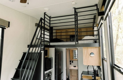 Enjoy a modern stay in our Timberwolf mobile unit, surrounded by beautiful nature! Relax inside with comfortable furnishings and visit the cozy coffee shop on the property. It's the ideal spot for your next adventure!