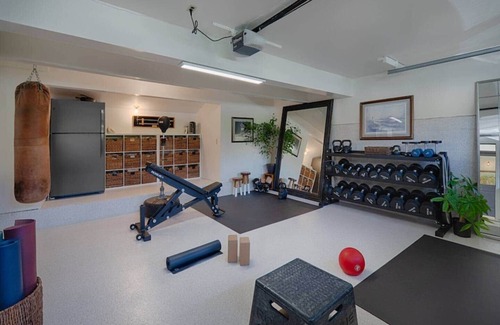 - Fully equipped home gym with weights, yoga mats, and vintage punching bag