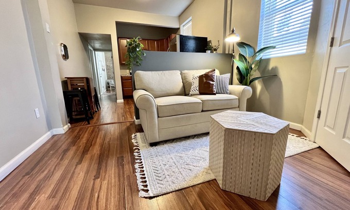 Relax in the comfort of a plush queen-sized bed adorned with extra pillows and linens. A well-appointed kitchen awaits, complete with essential cookware, a gas stove, microwave, and a quaint dining area. After a day of exploring, unwind in the cozy sitting area, perfect for enjoying your favorite shows on Netflix and Hulu.