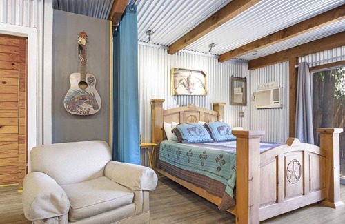 Rustic corrugated steel and rich wood paneling highlight the interior of this beautiful cabin, along with vintage cowboy accents. A feather-soft queen-sized bed and a full-sized futon in the living area provide comfortable sleeping arrangements for up to four people. The comfortably-appointed living and dining areas provide space for relaxing and socializing, and there's a kitchenette with a microwave, mini-fridge, and coffee maker. Coffee and disposable plates, glasses and silverware are also complimentary. All bed and bath linens are provided, and the full bathroom has a shower stall. Tech amenities include a TV with Roku and DVD player and Wifi, and air conditioning and heating.