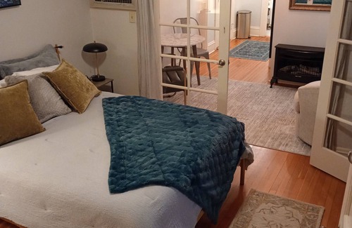 Escape to our cozy apartment in picturesque Portland. Guests can relax in the comfortable space and explore the vibrant city just outside their door. This special place is close to everything, making it easy to plan your visit. Welcome to our charming, fully furnished main-level flat at Irving Street Towers. Located in the heart of the trendy NW Nob Hill, steps from the popular NW 23rd and 21st Ave! Tons of Character in this historic hundred year old building, offering a blend of classic craftsmanship and modern convenience. The living room features a modern gas fireplace heater to keep you warm on cool Portland evenings. Stunning French doors lead to your very relaxing and cozy bedroom. Updated kitchen has stainless steel appliances, gas stove, newer cabinets, and tile countertops and floors. Adorable bathroom with a clawfoot tub and rainhead shower. For your comfort and entertainment, this condo comes with WiFi, a Smart TV, and utilities included! After a day on the town, come home to a fire, thumb through the records and take a listen on our new, yet classic Record Player equipped with Bluetooth. Additional amenities include secured deeded storage area, bike racks, and an on-site laundry facility. Please note that this is a hundred year old building with original hardwoods, windows, exposed brick, plumbing and electrical. This is to us, part of the Portland craftsman experience and historical charm of our city but note that this is not a new build. Also note the clawfoot bathtub is freestanding.