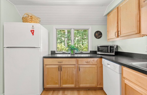 2 bedrooms (1 in Cottage, 1 in detached Cabin) plus extra sleeping options on peaceful & pet friendly acre near Acadia with fast Wifi, serene views to Ripples Pond (a wildlife sanctuary) and a fenced-in backyard. Roomy single-level cottage has a comfy California King mattress & 3 sleeper futons/sofas, with a full kitchen, full bathroom, and laundry. NOTE: the detached Cabin is only open May 1-Oct 31. Cabin has a tasteful tiny-home feel with kitchenette, bathroom, and Queen bed. Beyond the fenced-in backyard is a nature path to a private hammock and chill spot by Ripples Pond (view only, but just 1/2 mile away is Long Pond for swimming, canoe & kayak rental). Backyard includes grill & firepit. Tranquility awaits! NOTE: Cabin only open May-Oct. and has ceiling & box fans but no A/C.