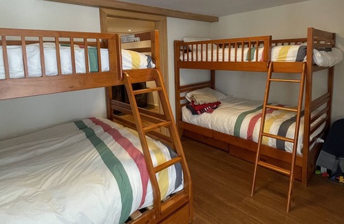 On the lower level is another family room, great for the kids to hang out. A 65-inch tv, foosball table, air hockey table, and another bedroom that sleeps 5 with 2 bunk beds in the room. There is also a walkout from the bedroom to the grounds. And a 2 piece bath plus a laundry room.