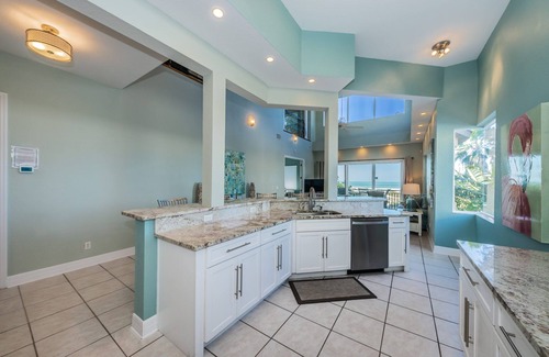 This exquisite beach house has a great bonus on the first level - A game room with a pool table that goes out to a wonderful outdoor kitchen area.