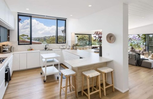 Ground Level: Walking through the large pivot door, you glimpse vistas of glistening cerulean water and native trees. The entertainer’s kitchen includes a movable island bench, ensuring the nominated chef feels connected to the conversation.