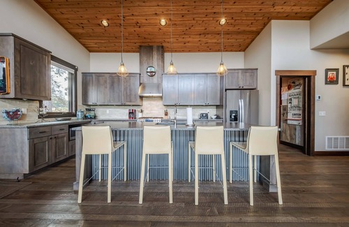 Indoors, soaring, wood-paneled ceilings on the main level sit atop open spaces expertly curated to maximize entertainment and connection with others. The glass door wall leading out onto the deck seamlessly blends indoor and outdoor living together, allowing for ample natural light and the fresh mountain air to flow freely through the home. Recline back on plush leather sofa and armchair seating in the living room while you surf the channels or queue up the big game on the mounted TV. The crackling propane fireplace will keep you cozy in the cooler months, creating the perfect ambiance for a family movie night.