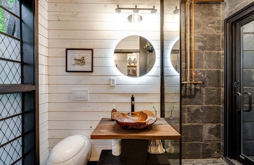 A fully stocked kitchenette highlights a petrified wood sink on a beautifully figured black walnut countertop with pour over artisanal coffee and tea making supplies, a water boiler, and locally made granola bars. Underneath is a fridge with filtered and sparkling water, a microwave, and a picnic basket stocked with compostable cups, dishes, and utensils. A bookcase along the hall turns out to be a secret door, opening to reveal a closet stocked with essentials including extra supplies, bath robes, an umbrella and a steamer iron. The loft has a queen bed, even more plants, and a cozy little window seat nook that overlooks the forest. The bathroom features a custom vanity with a teak wood sink, a hovering “egg” toilet, reclaimed slate, and exposed copper plumbing for an indoor and outdoor rain head shower! Locally made artisanal hand soap, shampoo, and body wash are provided in a custom Treetop Hideaways rosemary mint scent, along with 100% cotton towels and washcloths. Heading outside, you will find a large wrap-around deck with multiple trees growing within it, a hammock, a patio table with seating for four, and a teak lounge chair hidden away in a corner. Below the treehouse is a Titan Smokeless Fire Pit stocked with wood, charcoal, fire starters, grilling and s’more supplies, with two chairs and additional stone bench seating.