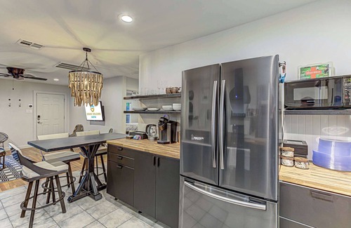Head indoors to relax and unwind in bright, open spaces that can be described as anything but boring, expertly curated with unique décor. Sink into the intentionally weathered leather sofa in the living room while you stream all your favorite entertainment on the mounted smart TV. Steps away, the stylish kitchen is a chef’s delight, showcasing stainless steel appliances, butcher block countertops, and sleek dark cabinetry stocked with cookware and dining ware. For takeout and homecooked meals alike, dining happens together at the extended counter with high-top stools for 4.