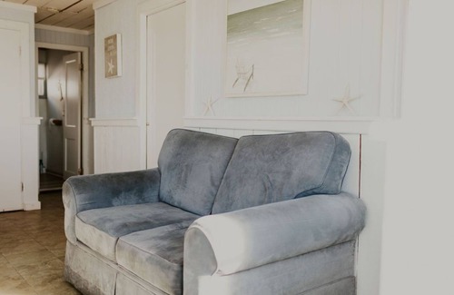 The cottage has a living room overlooking the ocean, fully stockedeat-in kitchen and a bathroom with stall shower. There are three bedrooms, two with a full sized bed and one with a single set of twin bunk beds. The living space is cozy and the wraparound deck offers additional space to enjoy the sunshine and salty air.