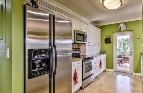 Main house features the primary suite with king bed, ensuite bath, and French doors to the screened in porch. The decor is in an elegant West Indies palm tree style. Also in the main house, the "Under the Sea" guest room (queen bed) with it's own private balcony. There is another full bath off the hallway. The kitchen has stainless steel appliances including a Keurig coffee center for both individual cups and a full carafe. There are new granite countertops. Enjoy cooking with the newly added air fryer and all the utensils you need for a gourmet meal. The kitchen shares a bar with the dining room, giving additional seating to the large dining room table. The living room features 2 couches (one being a sofa bed), recliner and entertainment center with TV and games.