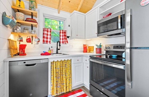 The red cottage is designed with classic coziness and togetherness in mind. There's a beautiful woodstove to enjoy in the fall and winter and the little loft area is perfect for a reader, writer or napper in your midst! There's a work table and lamp if you need a fresh work space.