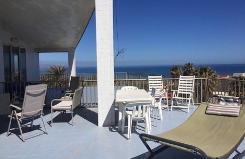 veranda overlooking the sea equipped with deck chairs, table and chairs for outdoor dining.