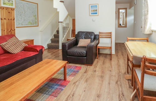 Amenities: Ground source underfloor heating and solar panels. Electric oven and hob, microwave, fridge, shared use of washing machine and tumble dryer, TV with Freeview, DVD, WiFi. Fuel and power inc. in rent. Bed linen and towels inc. in rent. Off road parking for 3 cars. Rear enclosed courtyard with furniture, plus front lawned communal garden. Sorry, no smoking. Shop and pub 2.5 miles. Note: There are 5 tread stairs between the lower and upper ground floor levels and a ½ tread to the floor level of the kitchen. Please note: bookings must fall between Friday to Friday. Please Note: This property offers a car charging point available for guests to use on plug in hybrid or full electric cars.