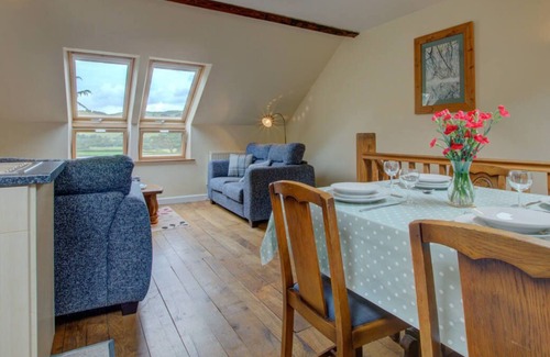 An attractive barn conversion, with stone and timber-clad walls, on the owners' working sheep farm in the Dyfi valley. The 'upside-down' accommodation ensures lovely views over the river meadow to the hills beyond from the first floor living room window. Some attractive features, including slate floor in the hallway, and home-grown oak staircase and floorboards. The cottage is attached to the owners' farmhouse, situated on Glyndwr's Way, and with other good walks from the door.