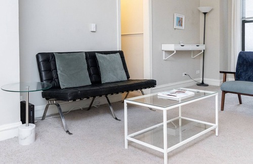 Enjoy green space galore with this apartment! Overlooking Jackson Park, a 600-acre green space that borders Lake Michigan and provides city-dwellers with a gorgeous place to stroll, this one-bedroom includes a farmhouse-style kitchen, granite countertops, walk-in closet, and airy living room. Whether you want to spend your stay lounging in this minimal oasis or exploring all the treasures just outside your door, this apartment is sure to fit your travel needs.