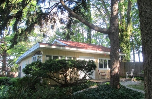 The first things you will notice when you walk in the cottage are the soaring vaulted ceilings, and the gorgeous wood floors in the living area. The living room is beautifully appointed, with lots of great light. The bedrooms are smaller; one with a Queen, and one with two twins. There is one bathroom with a shower. Both the kitchen and dining areas are bright and cheery, with sliding glass doors leading to the outdoor deck area. Located in Lakeside, less than ½ block to the private beach.